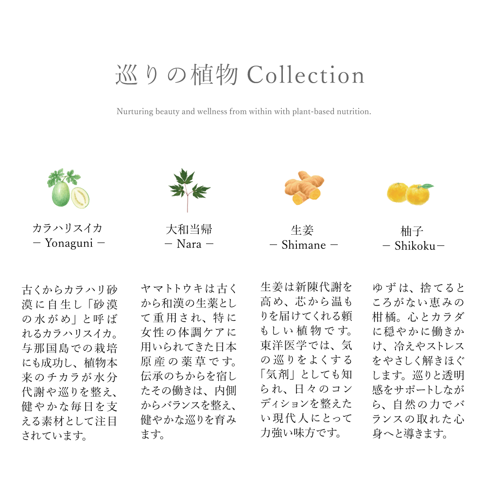 | 原材料・産地 | カラハリスイカ:沖縄県・与那国島産 大和当帰葉:奈良県産 有機生姜:島根県産 有機柚子:四国産(徳島県・高知県) |